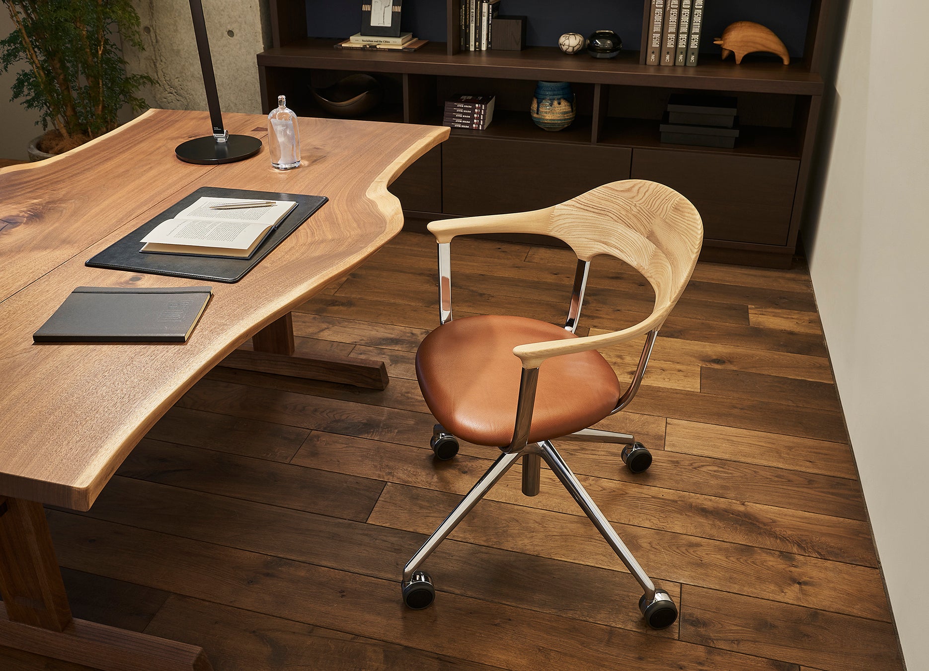 FOURチェアーは、コロナ禍での在宅ワークが定着する中、自宅で仕事用に使う椅子の重要性について、生活者の気づきが顕在化したことに端を発しています。オフィスで使うワークチェアーやエグゼクティブチェアーには機能性やデザインの優れたものが数多くありますが、在宅ワークの主な場所である家庭のリビングダイニングにさりげなく溶け込み、食事用としてもそのまま使える椅子はこれまでほとんど存在しませんでした。このFOURチェアーは、開発を担当したアクタスとカンディハウス、デザイナーの倉本仁氏、そして技術監修のコクヨの4者の知見が、繊細な意匠の中に結集しています。
